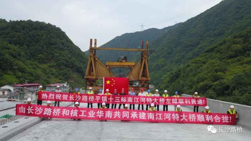8月 17 日 17 時(shí),隨著南江河特大橋左線最后一片箱梁架設(shè)完成,標(biāo)志著橋梁左線順利貫通。該項(xiàng)目由長(zhǎng)沙路橋和核華南建工共同承建,是全線橋梁中的長(zhǎng)度之最,左線共計(jì)81跨,橋梁長(zhǎng)度2.4公里,橋面單幅寬度12.65米,橋面到地面高度約30米,平鎮(zhèn)LJ-13合同段長(zhǎng)沙路橋承建樁基224根,預(yù)制箱梁440片。
