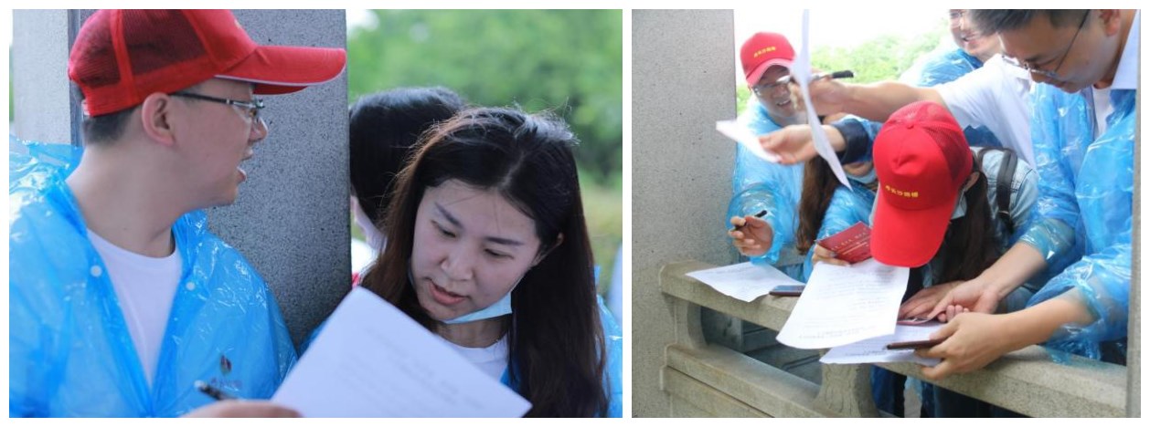 下午兩點,全體人員統(tǒng)一乘坐地鐵來到橘洲游客中心,整個健步走全程5公里,每四人一組,大家自由組隊,每隊到四個指定答題點進行黨史學習教育題目作答,最終決出三支優(yōu)勝隊伍。出發(fā)之前,大家還用簽字筆在紅色扇面上一筆一劃寫下了“不忘初心、牢記使命”“紅心向黨”等對黨的宣言。