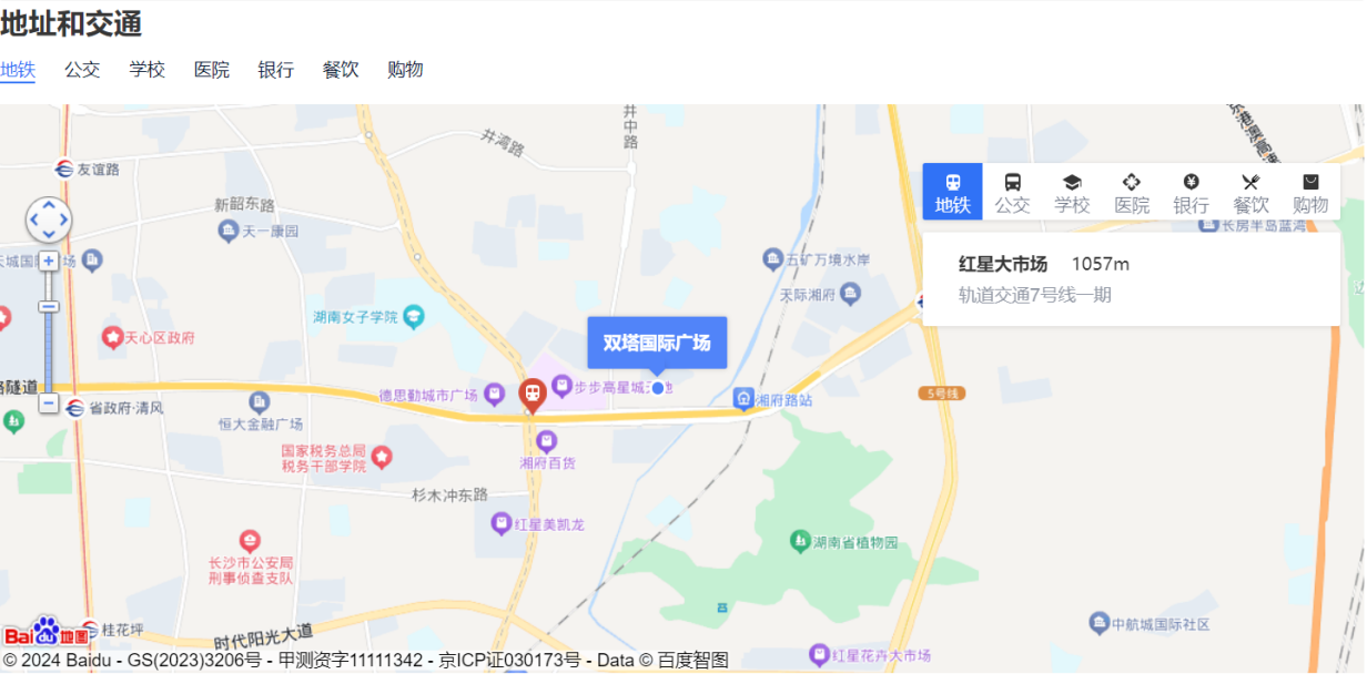 周邊交通便利,位于紅星大市場(chǎng)對(duì)面,距離德思勤約2公里、城際鐵路湘府站500米、長(zhǎng)沙汽車客運(yùn)南站約5分鐘。